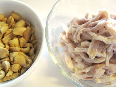 Sprinkle raw chicken with sake and salt, steam and let cool. Roughly chop up the peanuts. You can use them as-is but chopped will be easier to mix in with everything.