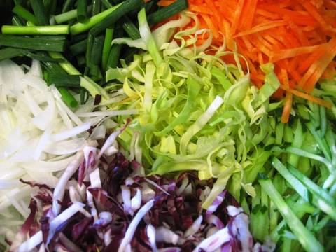 Julienne the vegetables. Cut the carrots thinly and the green onions into 4cm pieces. You can use other ingredients as long as the total comes to 40% of the amount of cabbage.